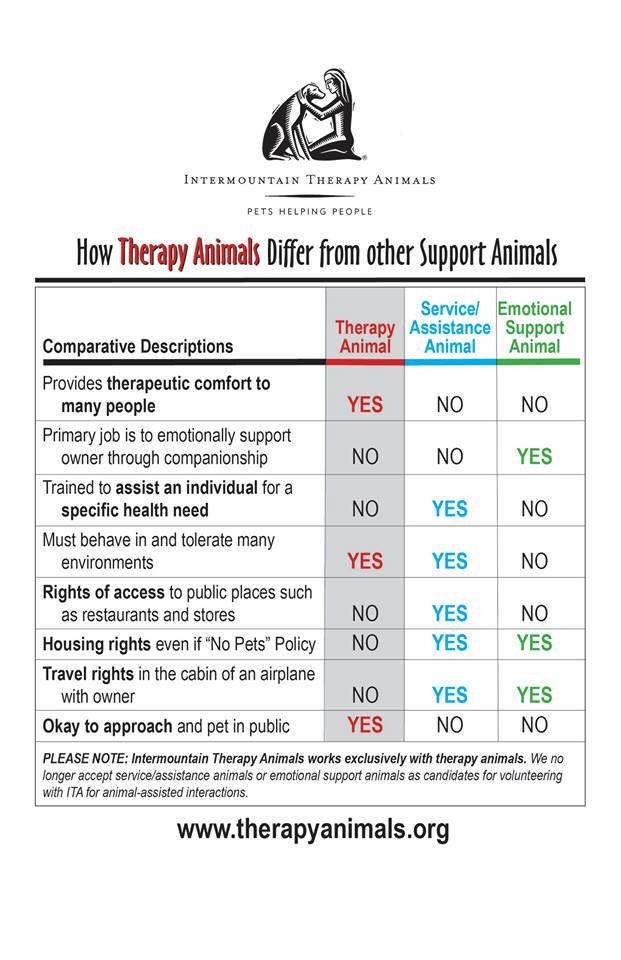 What makes a person and animal suitable to be an ITA Volunteer Therapy Team? Please note that having a Therapy dog is different than preparing our dog to be a sevice dog for you or a family member - see graphic. Download the ITA FAQ Sheet. For more information about Therapy Dog Class specifics download our FAQ sheet.